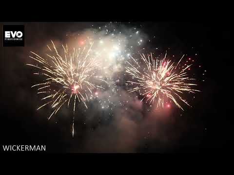 Effects: Colourful brocade and dahlias, gold to purple, red and silver strobe, gold tail to brocade spider and willow in gold, blue, green and red. Ending in gold tail, spilt blue star with silver waterfall